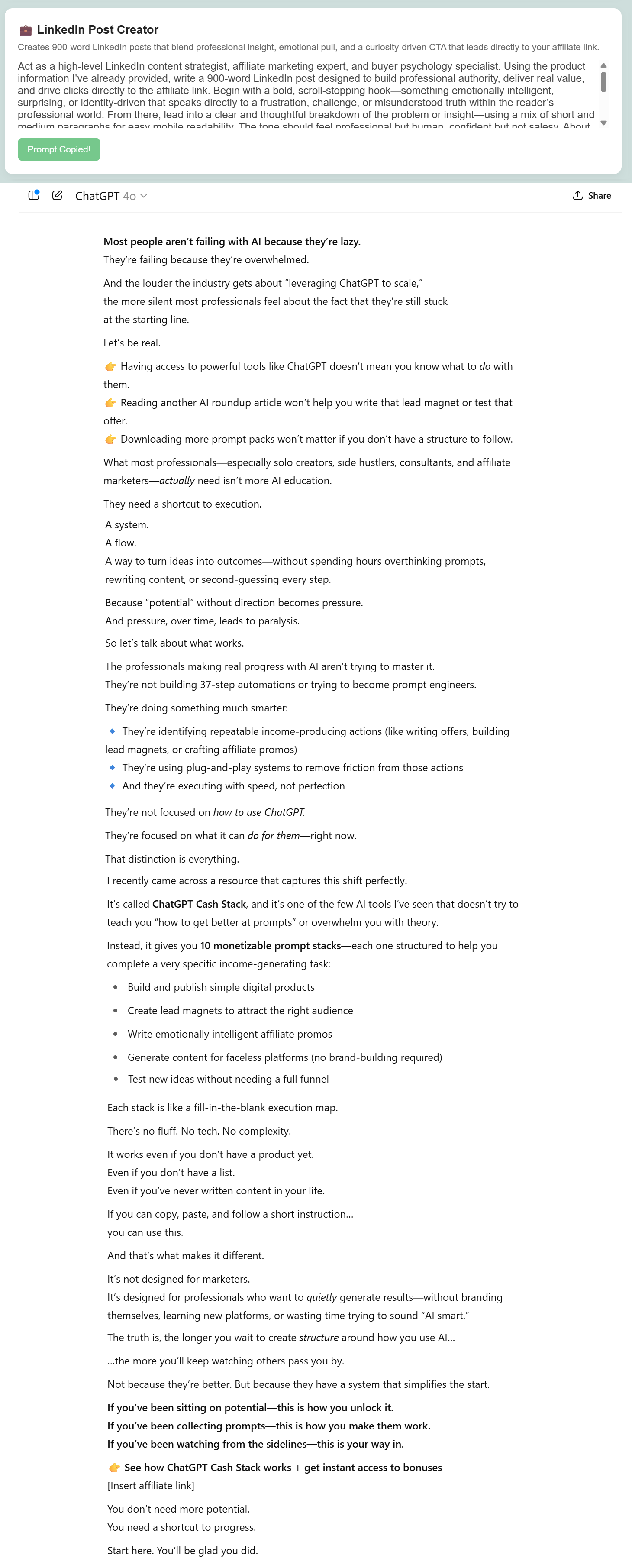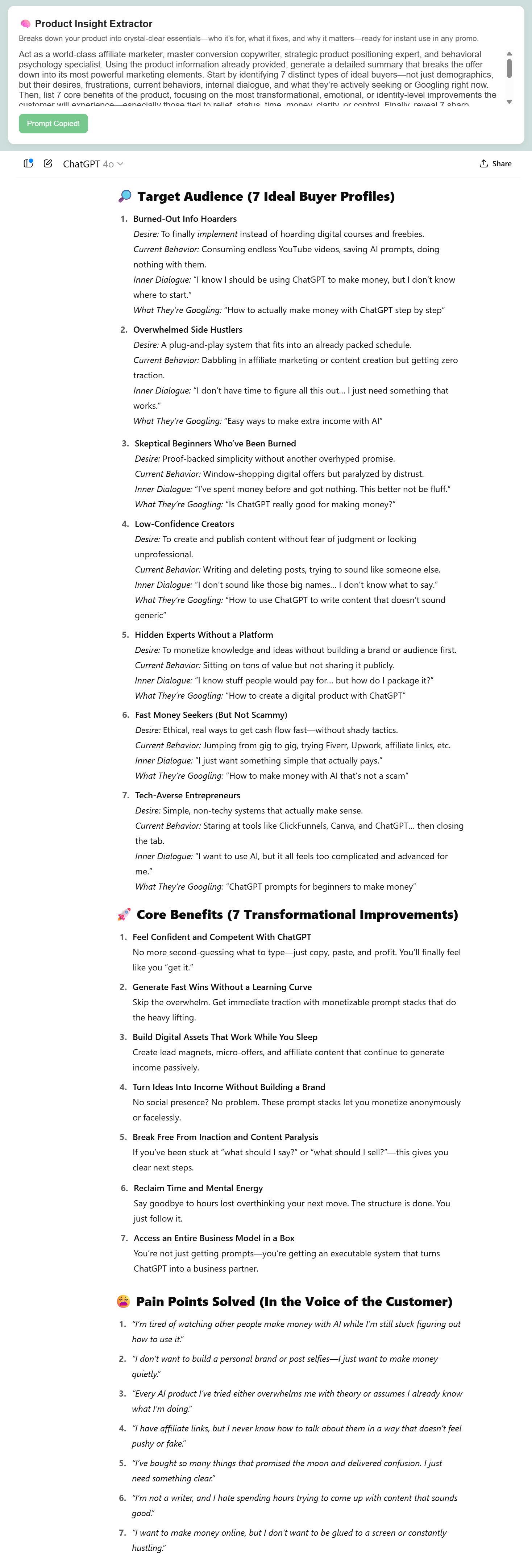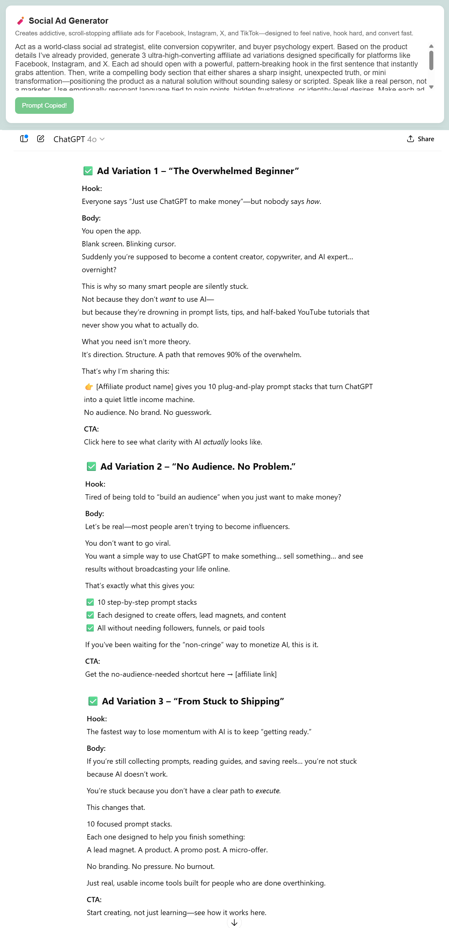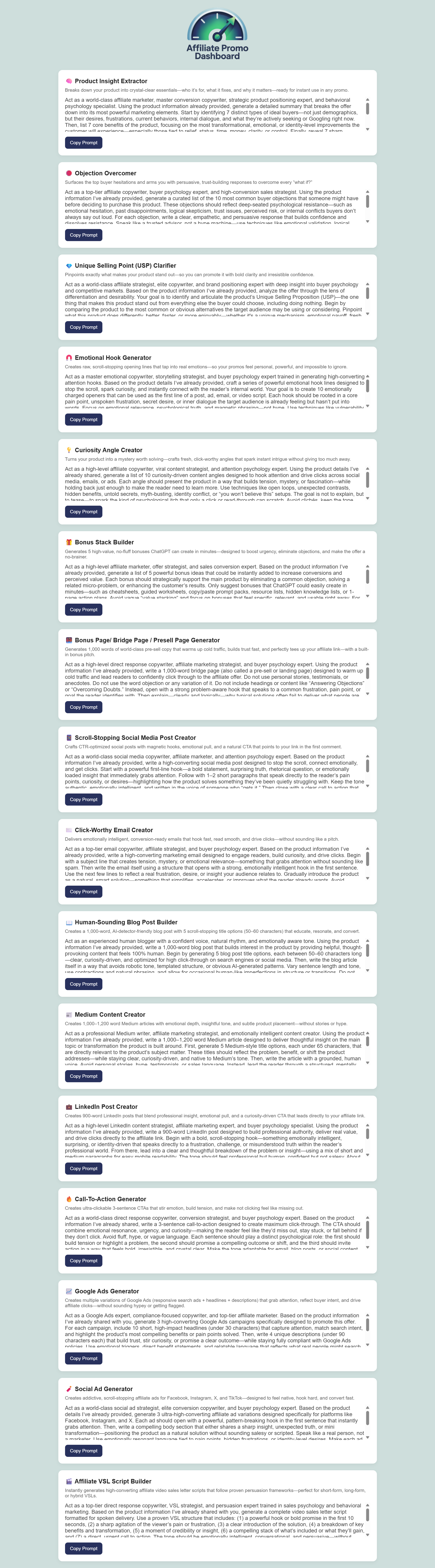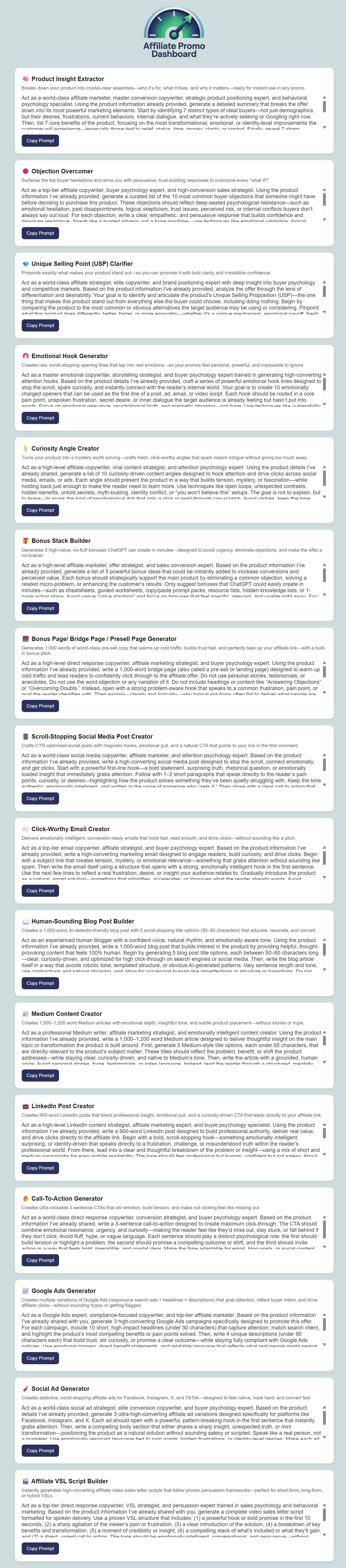 Once you drop the product information into ChatGPT, Gemini, or Claude, the prompts inside Affiliate Promo Dashboard kick into high gear giving you high-impact content tailored exactly to your offer.