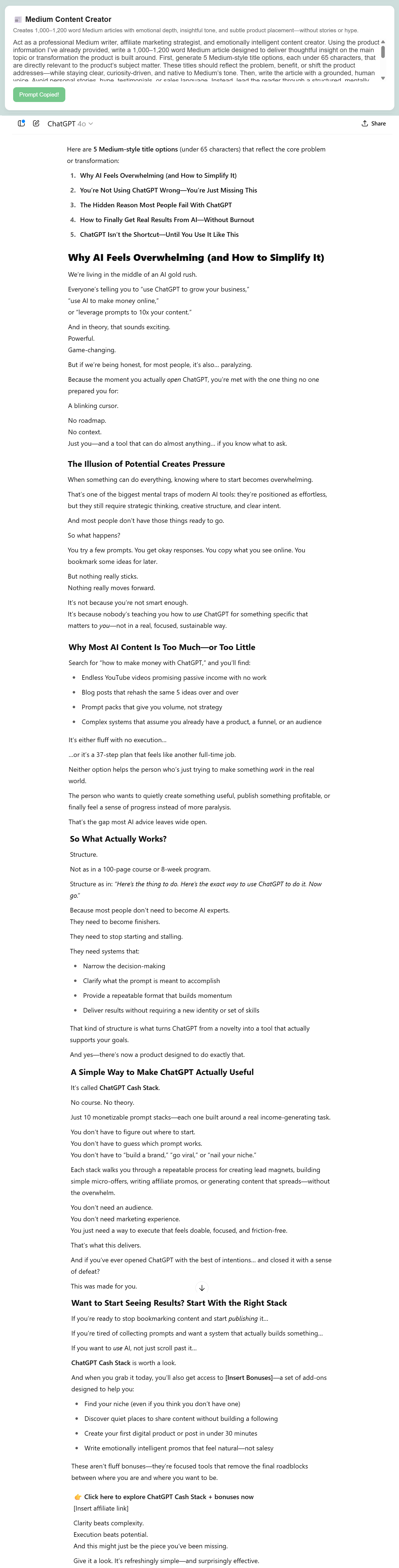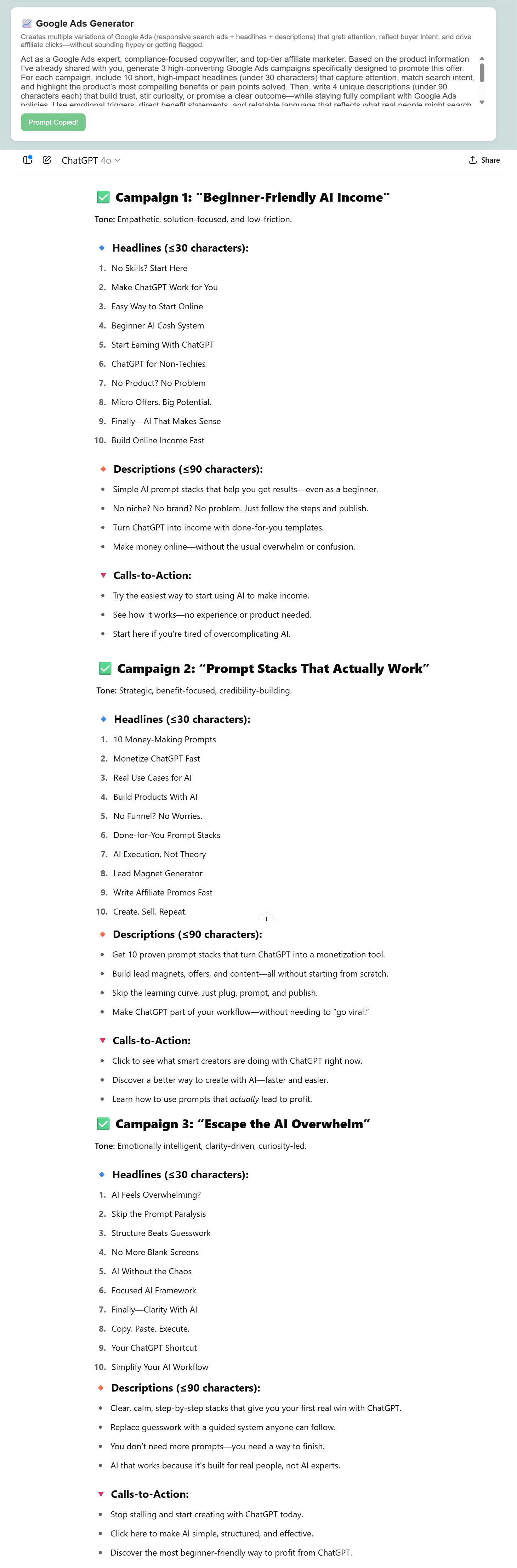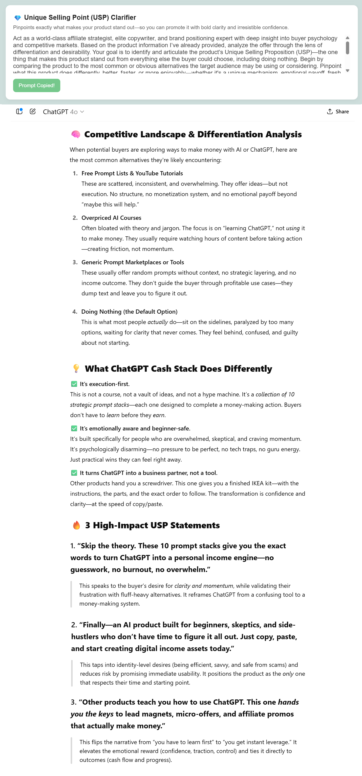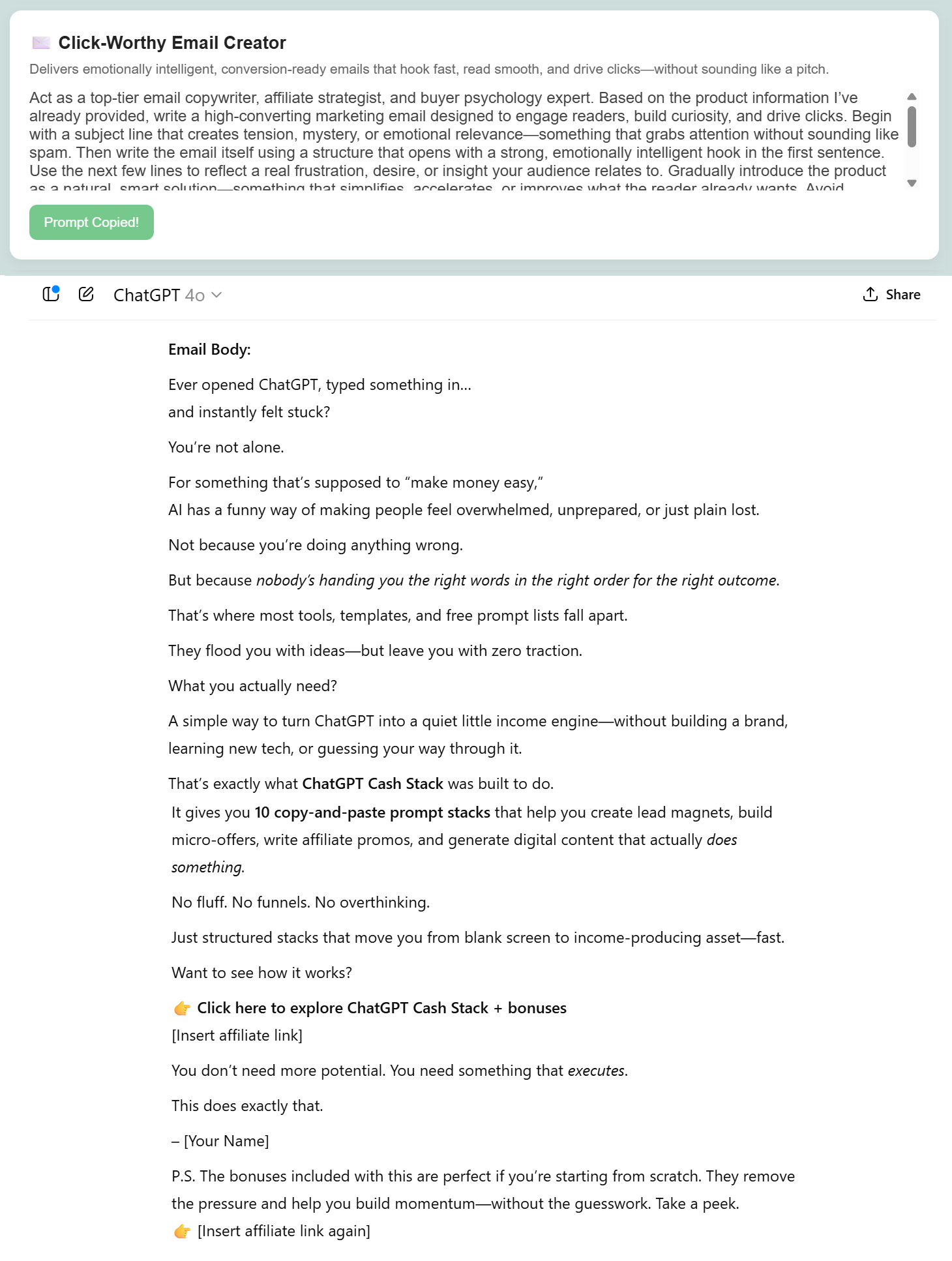 Once you drop the product information into ChatGPT, Gemini, or Claude, the prompts inside Affiliate Promo Dashboard kick into high gear giving you high-impact content tailored exactly to your offer.