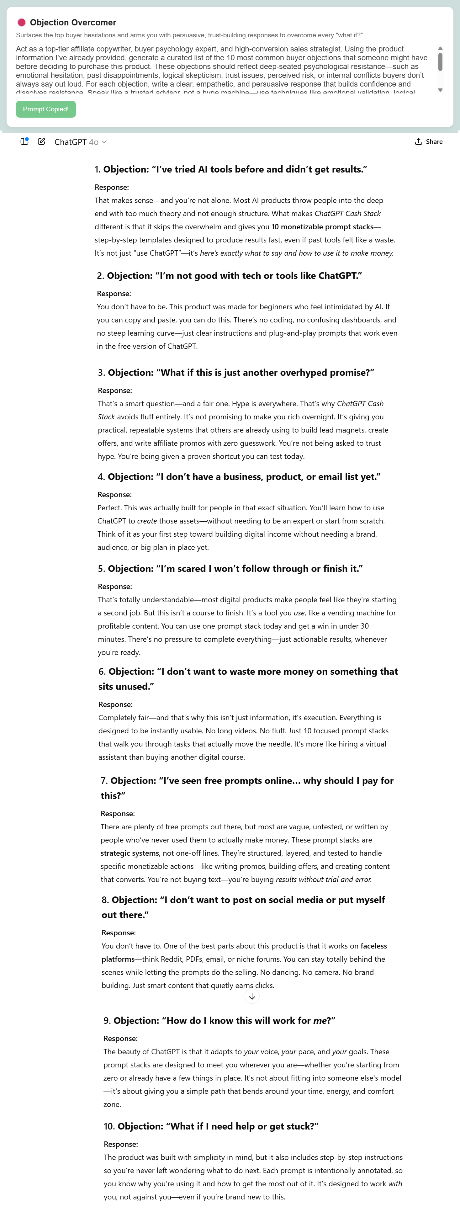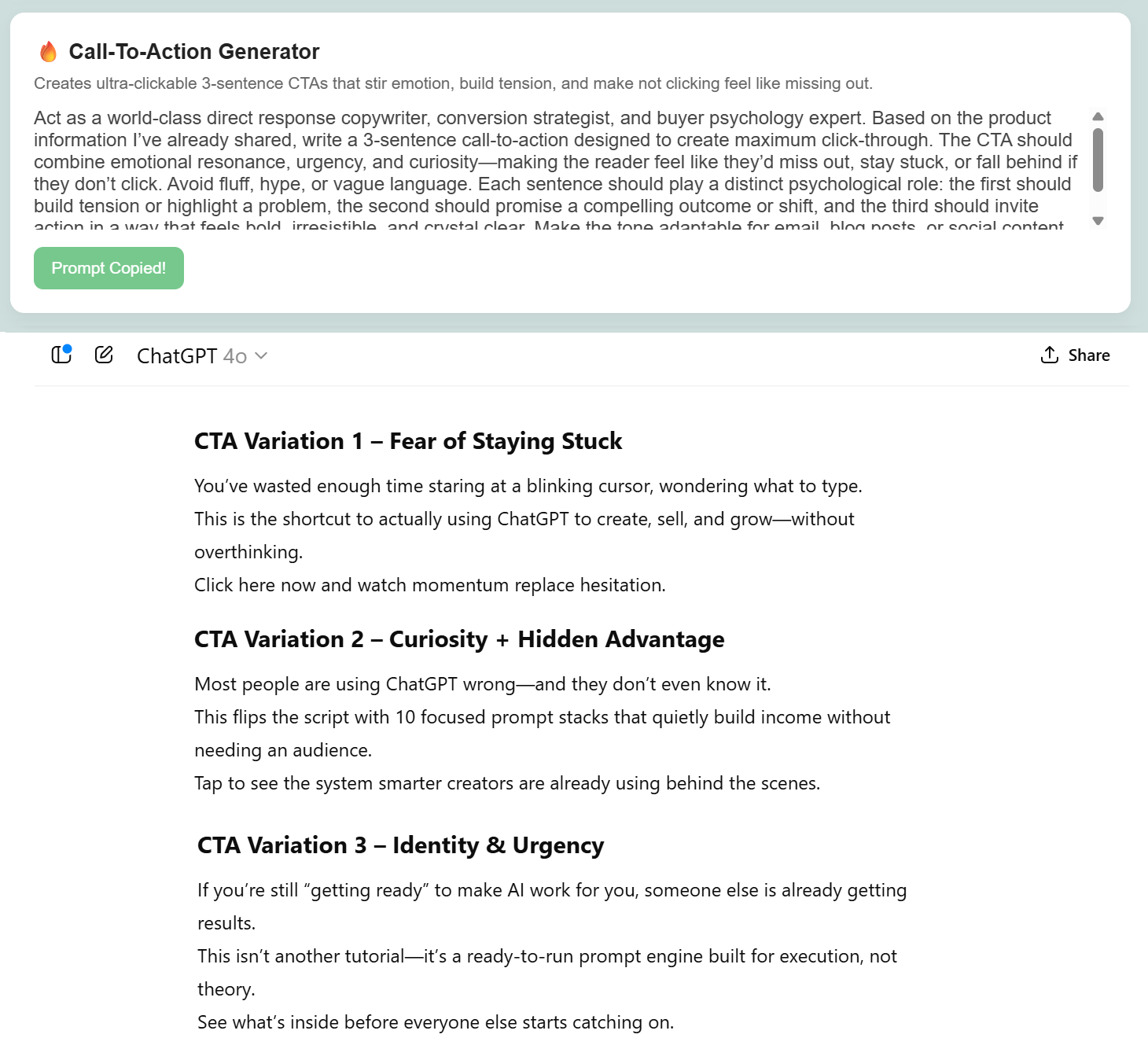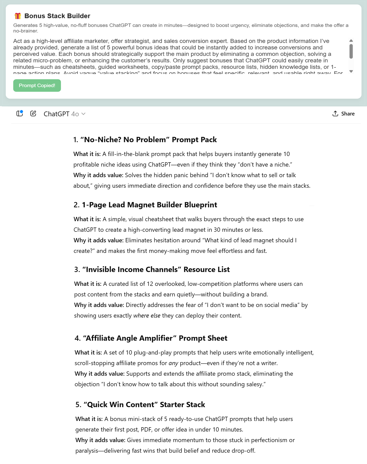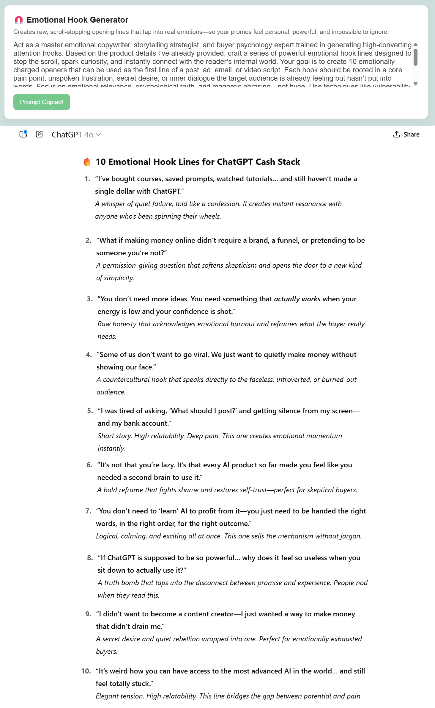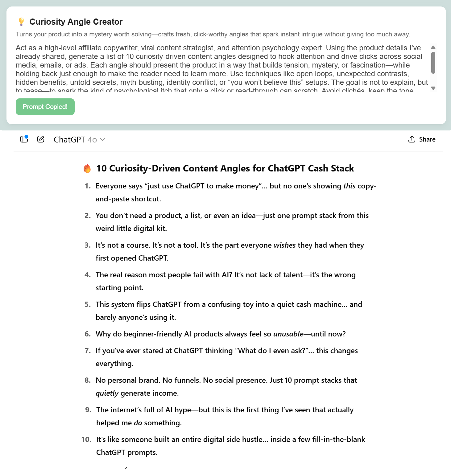 Once you drop the product information into ChatGPT, Gemini, or Claude, the prompts inside Affiliate Promo Dashboard kick into high gear giving you high-impact content tailored exactly to your offer.