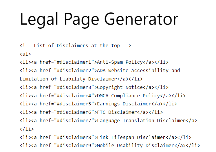 Create a page called "Legal Disclaimers" in WordPress, ClickFunnels, GroovePages, Systeme.io, or anywhere else. Copy the HTML code into the page and you're done! Then link to the page in your footer or menu.