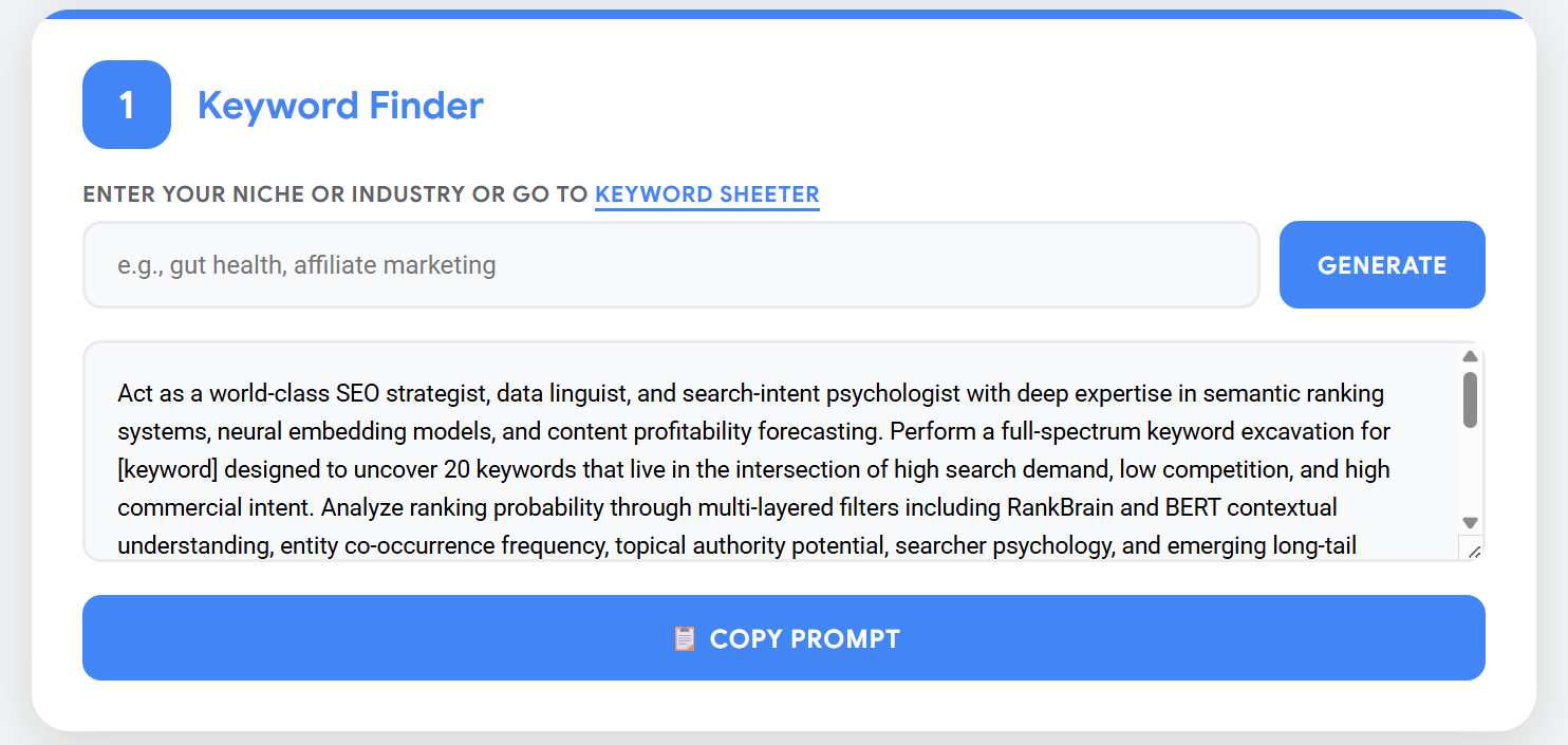 Each prompt inside the engine is precision-crafted with expert-level understanding of search engine behavior, content scoring, NLP, user intent, and latent topical relevance.