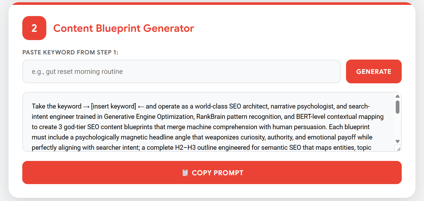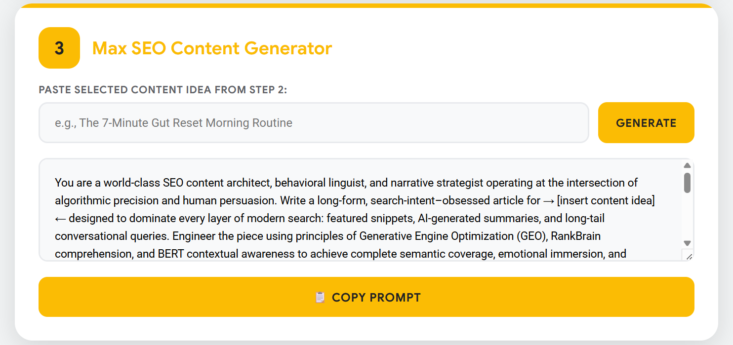 The prompt accounts for dwell time, internal linking, E-E-A-T scoring, AI-summarization behavior, schema design, and layered search intent — giving you content that dominates algorithms and captivates readers.