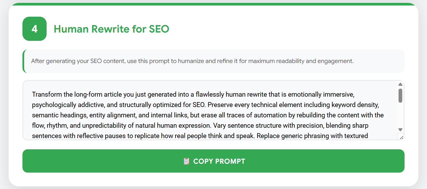 Now you elevate it even further. This prompt takes the entire article and rewrites it with human rhythm, emotion, unpredictability, and soul.