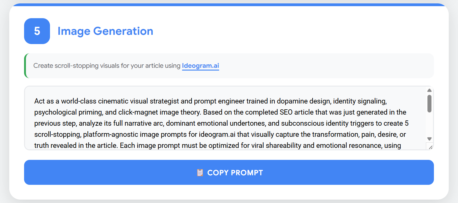 The final prompt transforms the emotional arc of your content into 5 visually magnetic prompts for ideogram.ai designed for blog headers, Pinterest pins, Instagram graphics, and more.