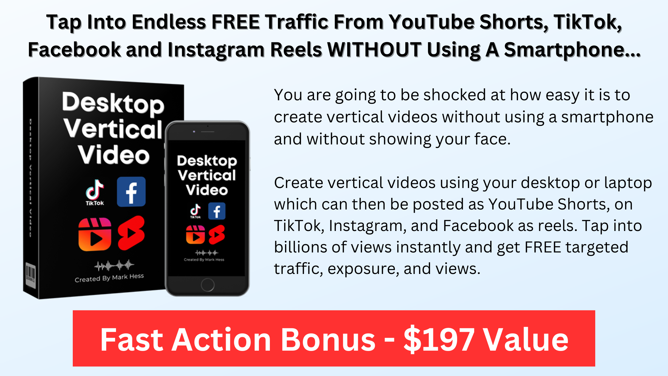 YouTube is a registered trademark of Google, LLC, TikTok is a registered trademark of Bytedance Ltd, Facebook is a registered trademark of Facebook, LLC, Instagram is a registered trademark of Instagram, LLC. This website is not officially affiliated with or endorsed by any of these platforms or sites. What is sold on this site is a digital training product which teaches people how to use these platforms to get traffic, views, and exposure easily by creating vertical videos from their desktop or laptop.
