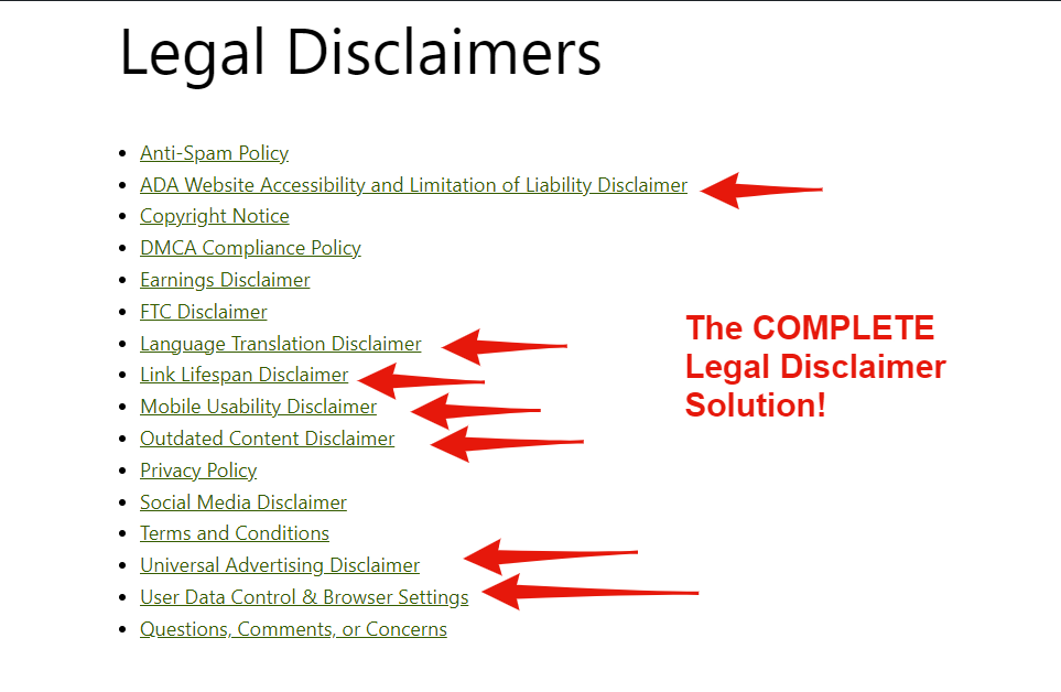 This is the ultimate one page legal disclaimer you should have on ALL of your websites and marketing pages featuring clickable links to each individual section.