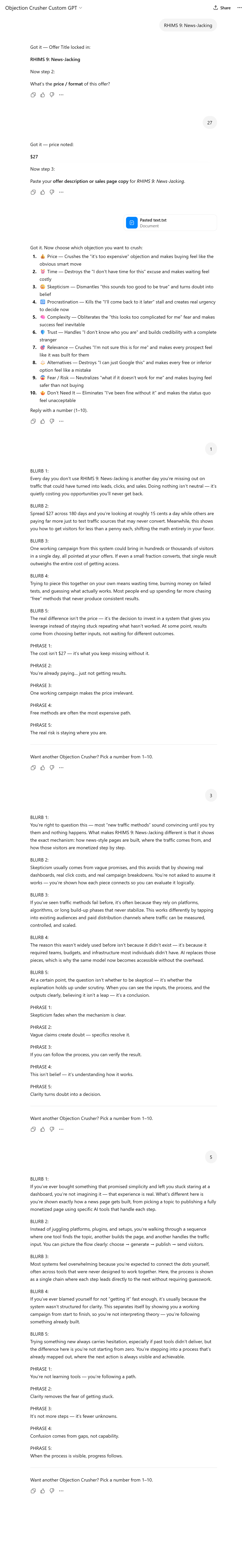 You simply enter in your offer information and the GPT will automatically start creating any of the 10 objection-crushing blurbs and phrases immediately.