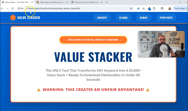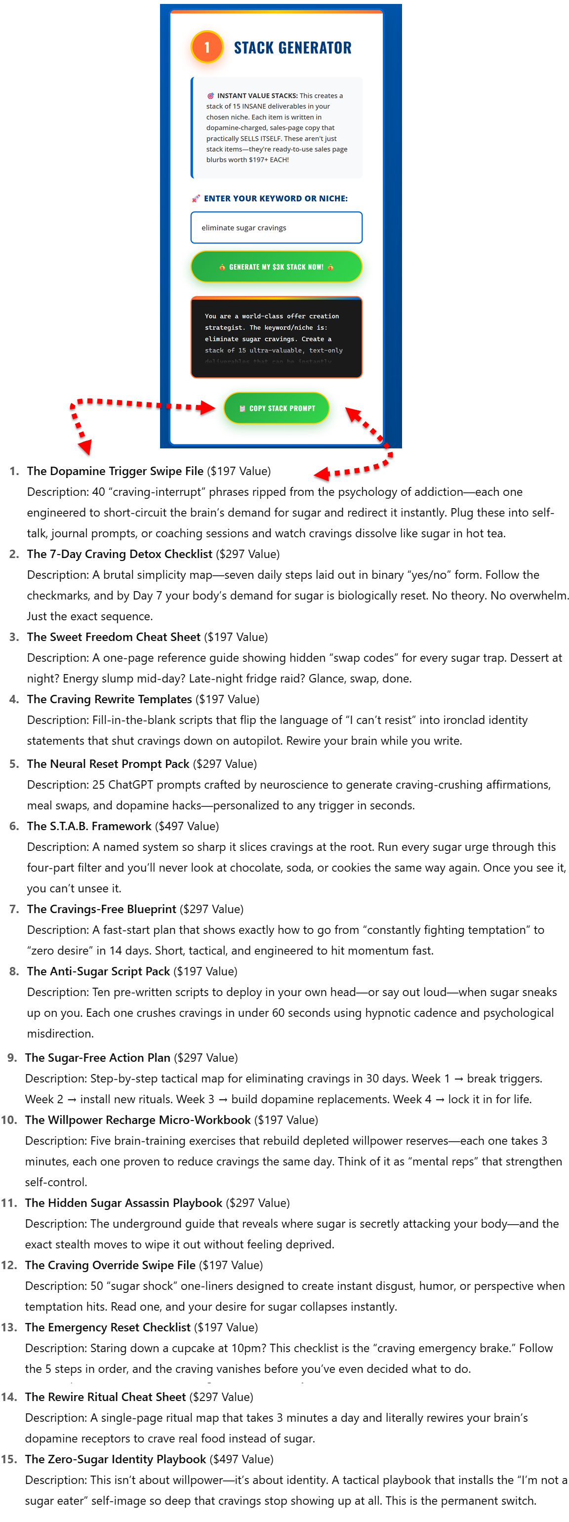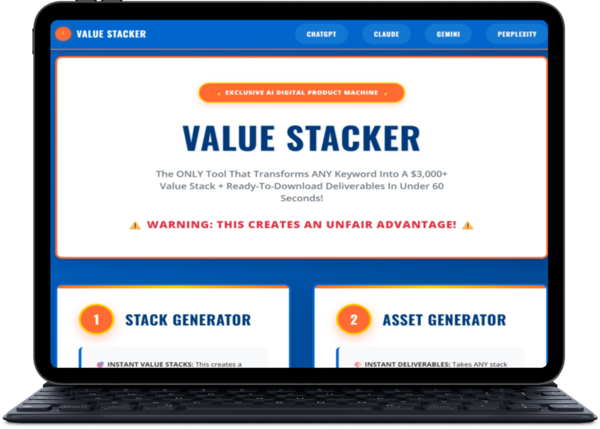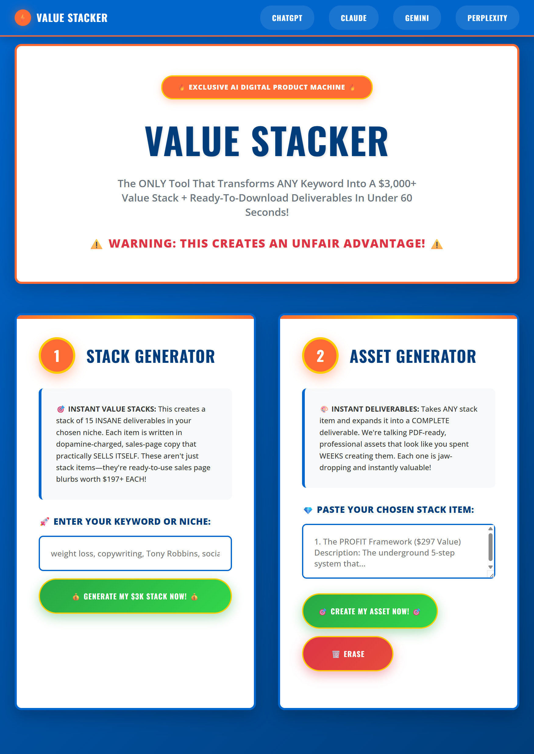 Just drop in ANY topic, niche, or idea and Value Stacker reverse-engineers a complete stack of premium deliverables that feel custom-built, hyper-relevant, and impossible to ignore.