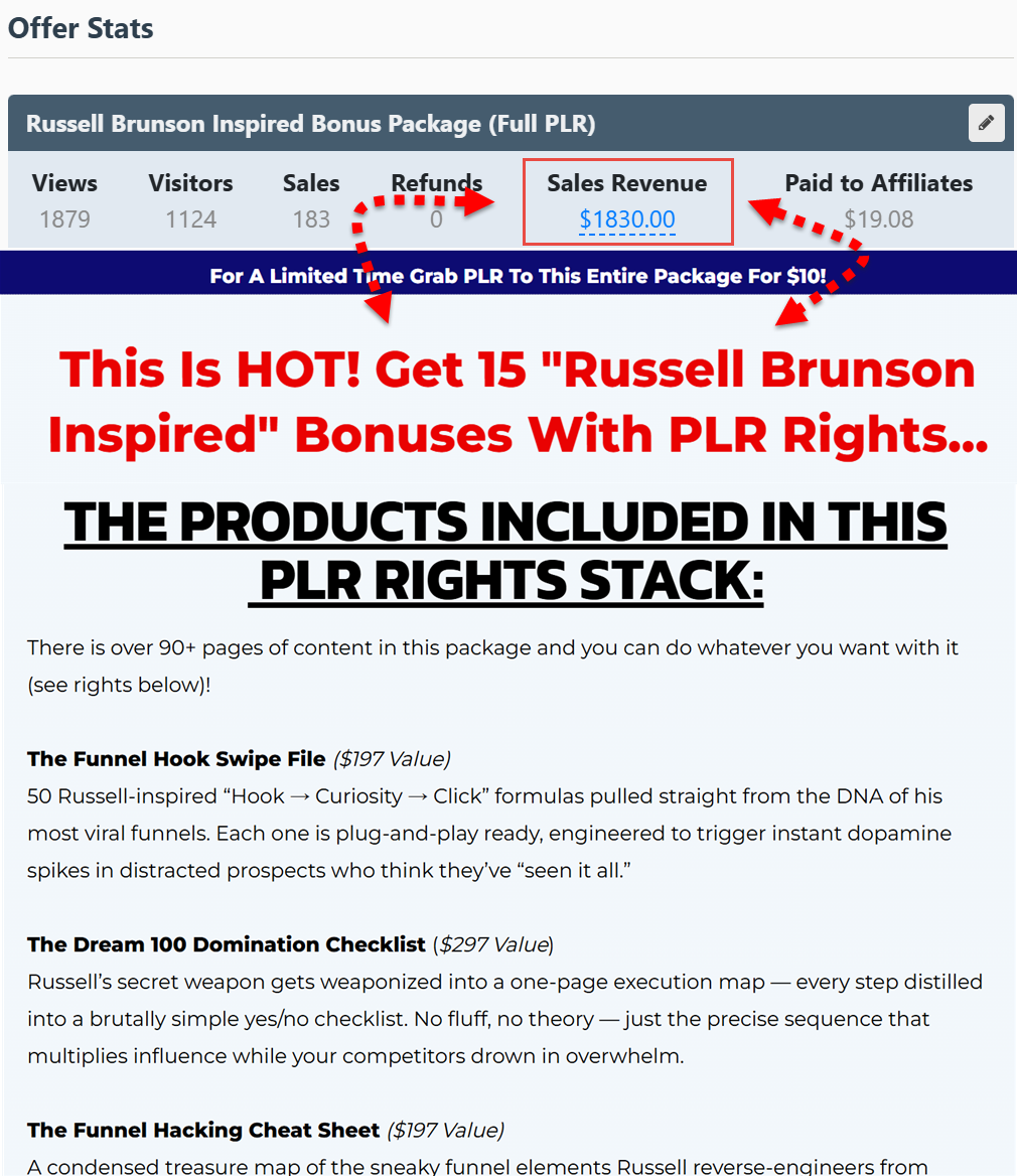 I packaged the 15 PDF/Word files together and sold them as a Russell Brunson inspired bonus stack with PLR rights, mailed my list, and made $1,830 in 24 hours.